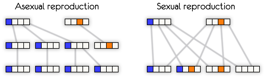 Глядя на эту схему, становиться понятным, что половое размножение намного эффективнее.