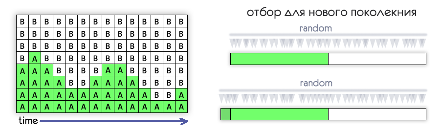 Если позапускать несколько раз, то можно получить небольшое состязание пары вариантов генома