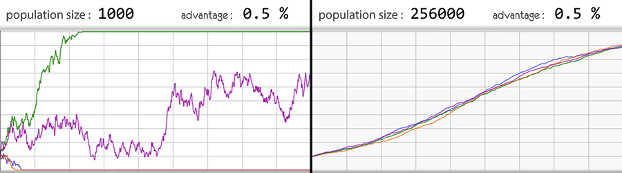 Здесь стоит показать дополнительную модель, показывающую, как в популяции меняется частота вариантов одного и того же гена при смене поколений и как от размера популяции зависит эффективность естественного отбора.