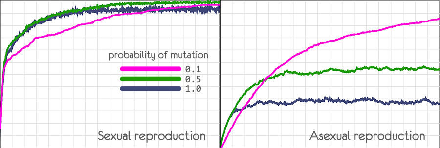При половом размножении вероятность мутации 0.5, при бесполом 0.1