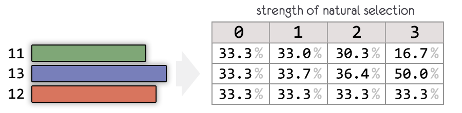 При значении force of selection = 1 , разница в выборе представляет из себя доли процента, но развитие всё равно происходит.