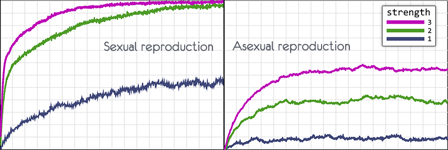 Экспериментируя с моделью, можно убедиться, что при половом размножении не просто возрастает скорость, с которой растёт приспособленность популяции, но и возрастает граница к которой приспособленность может достигнуть.